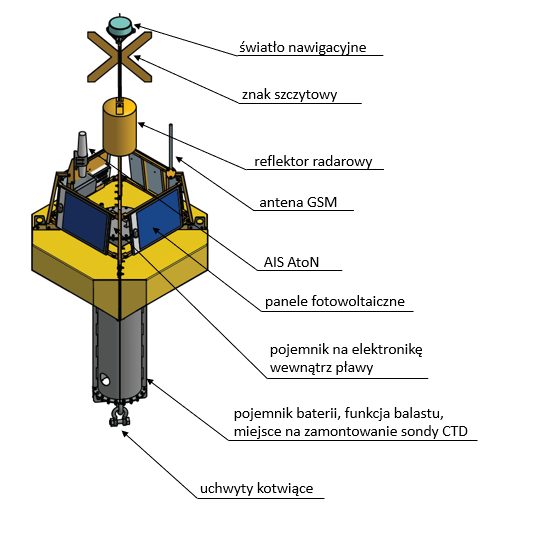 Układ zasilania: 4 panele PV, każdy o mocy 20 W. Dolną część pławy stanowi zasobnik zawierający baterię o pojemności 10 kWh.